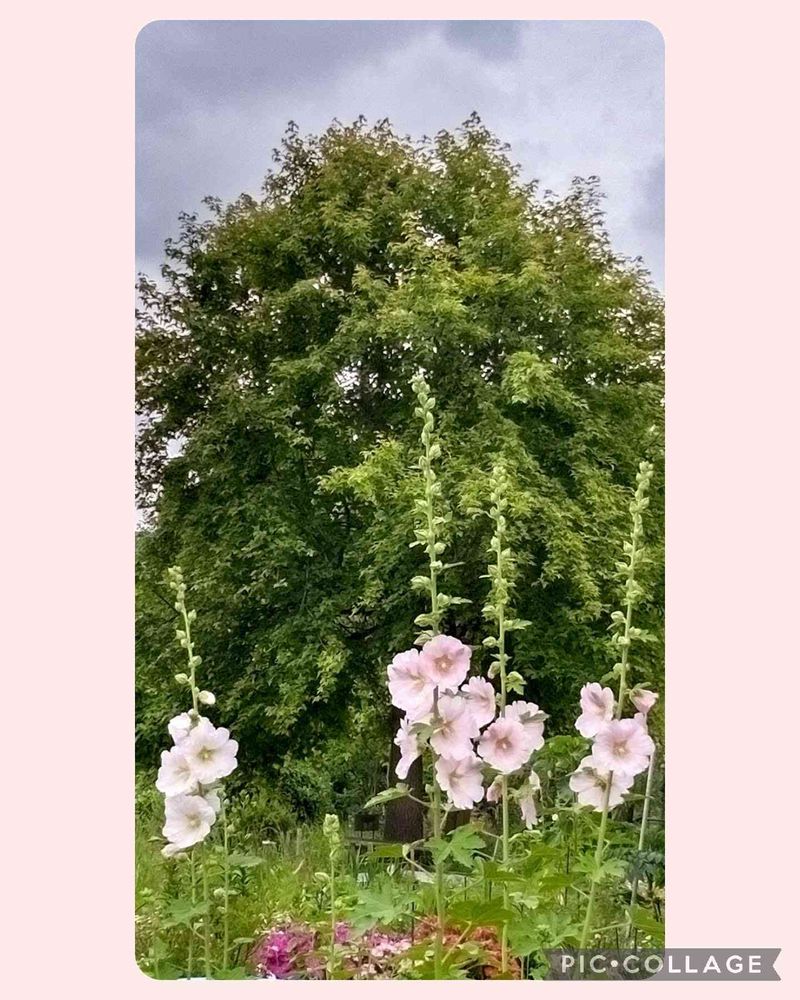 大きな木の前にタチアオイでしょうか?🌸🌸