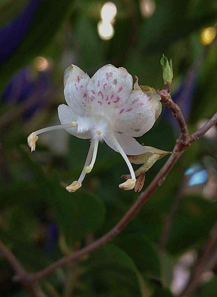 バイカツツジ 梅の花とツツジと両方名前に入ってますね。お花が白地に紅い斑点模様で花弁がそりかえって蕊がしっかり出てますね。良く見ると葉っぱ🌱がツツジの様で。なるほど🤔と思わせるpicとコメントでした。😄😄😺😸😆🤭😊