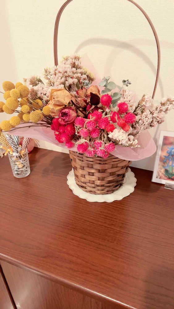 素敵なかごを頂いたのでドライフラワーを飾りました😙