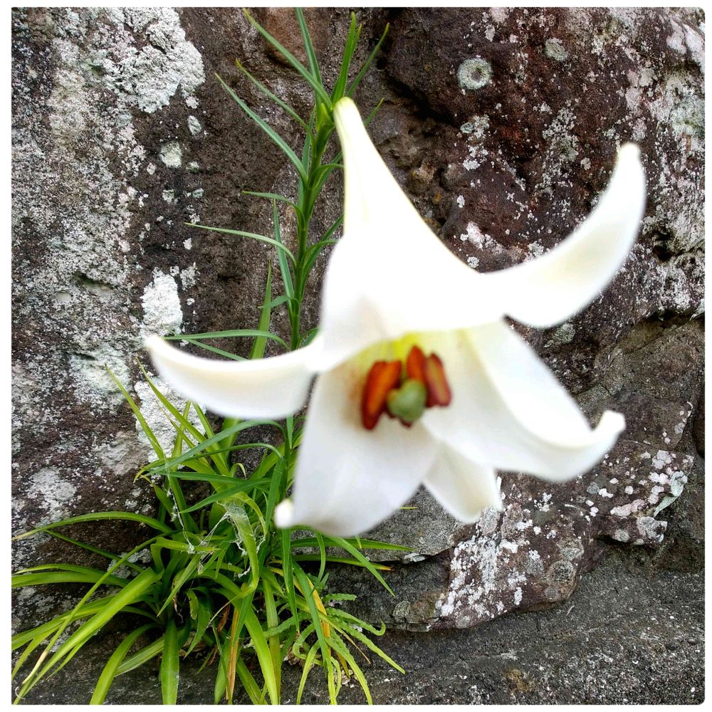 石垣の間から咲いたばかりで、花粉に汚れていない真っ白な百合で綺麗😍
