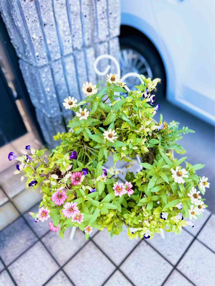 先月作り直したハンギングリースですが、ジニアプロフュージョンがだいぶ咲いてきました。ガザニアも蕾が出でいます。