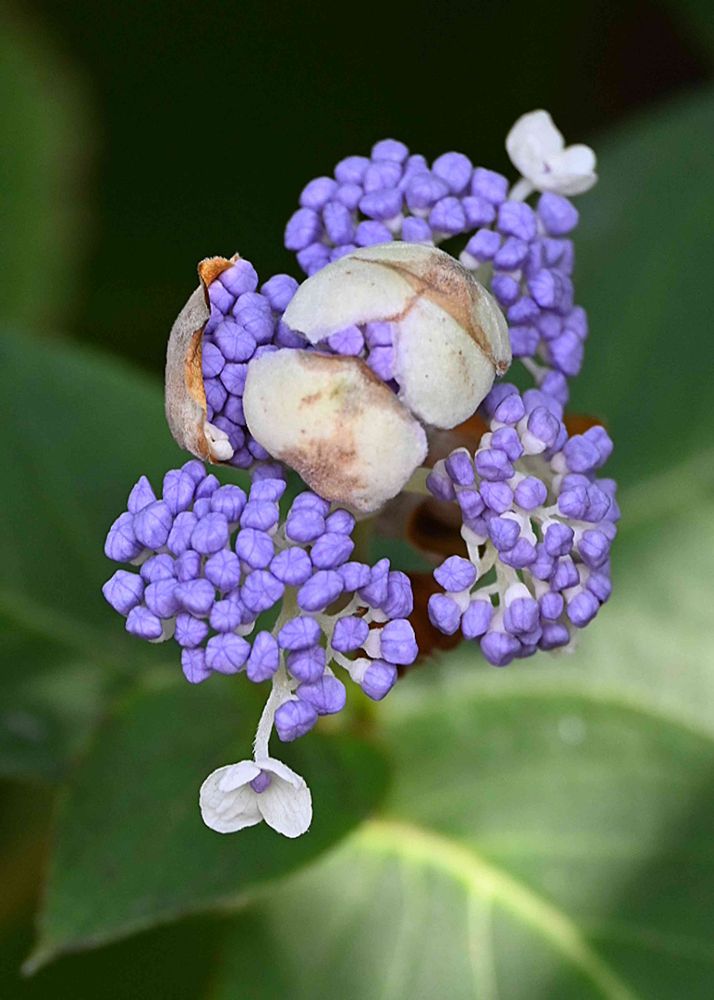 蕾は苞に包まれ、直径2~3.5㎝の球形になり、花期が他のアジサイより遅いのが特徴である。白い装飾花は3~5個。すべて装飾花になるものはテマリタマアジサイという。