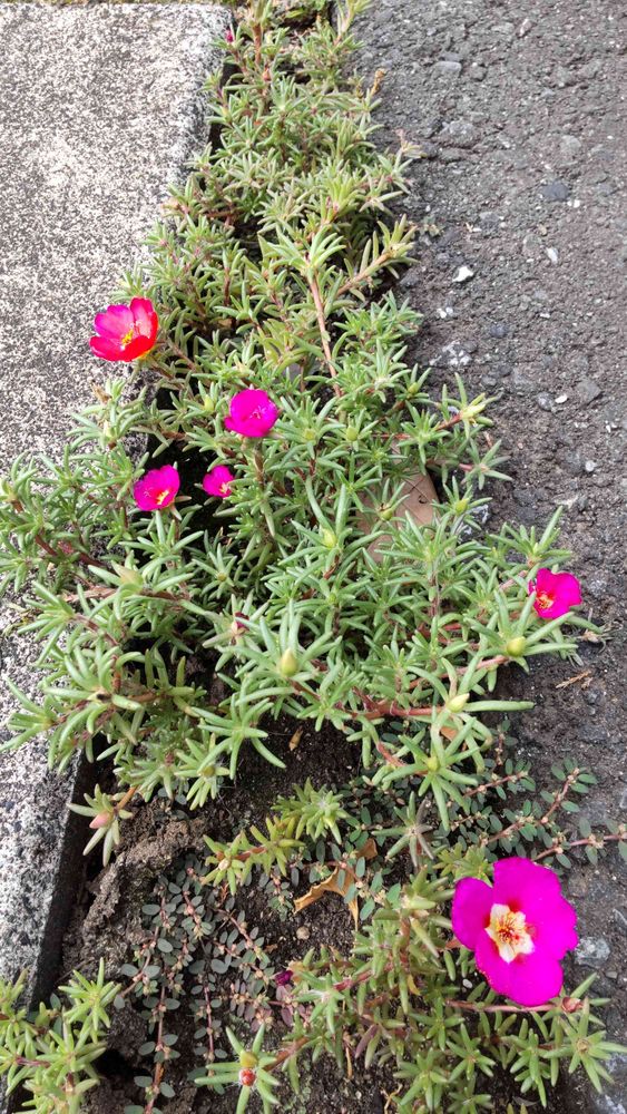その僅かなスペースに、こぼれ種からマツバボタンが発芽して花を咲かせています。
