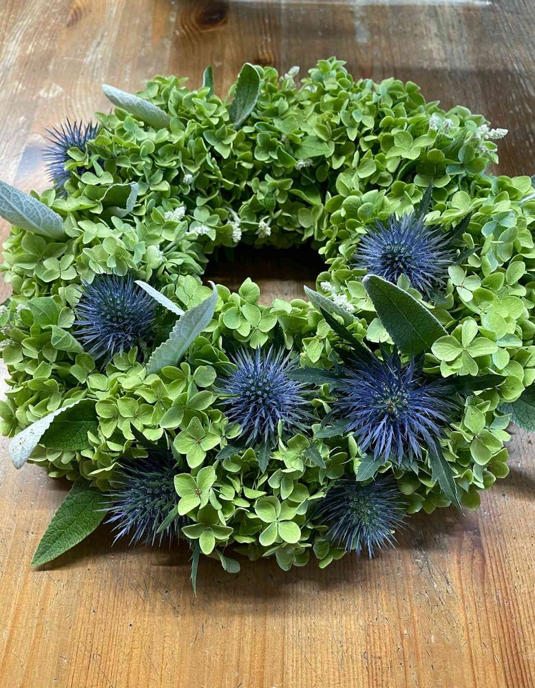 今年も、行きつけのお花屋さんのワークショップでアナベルリースを作りました💚💙💚