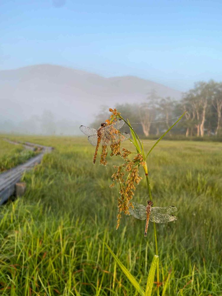 湿原に生えているアブラガヤという稲穂に見える植物一本一本の先端に、朝露で濡れた羽根を乾かすトンボたち。初めて見られた光景でした。