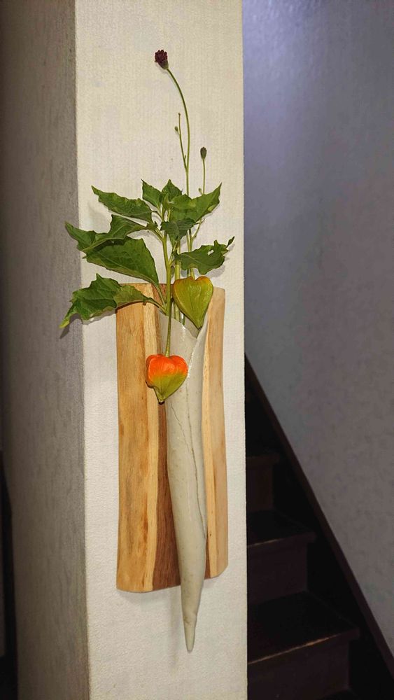 お盆にホオズキ、この花器に生けるのもいいと思います。ただ目立たなくていいので、花入れて欲しいところです。