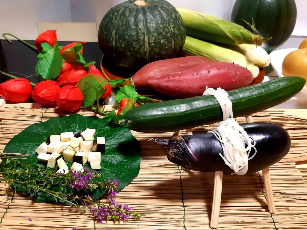 ナスとキュウリの背中に茹でたそうめんを乗せご先祖さまが帰る時の手綱やお土産を縛る縄に見立てているようです