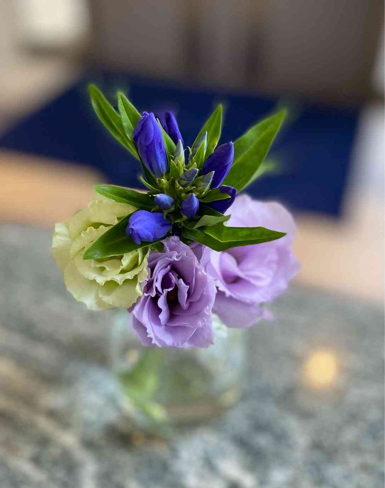 勤務先のエントランスに飾った、リンドウとトルコキキョウ💙💜