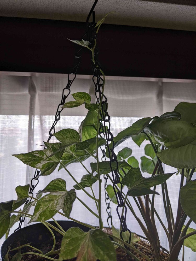 室内からグリーンカーテンみたいな仕立てはできないかなと思い、ハンギングで育てているシンゴニウム ホワイトバタフライとダイソーで種を買った燕朝顔です。