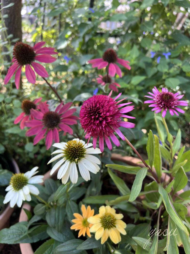 今日も園芸店を覗き、前回も欲しかったエキナセアのブルーベリーチーズケーキ(右奥)🩷をお迎えして、帰宅後嬉しくてすぐに鉢へ&記念撮影
