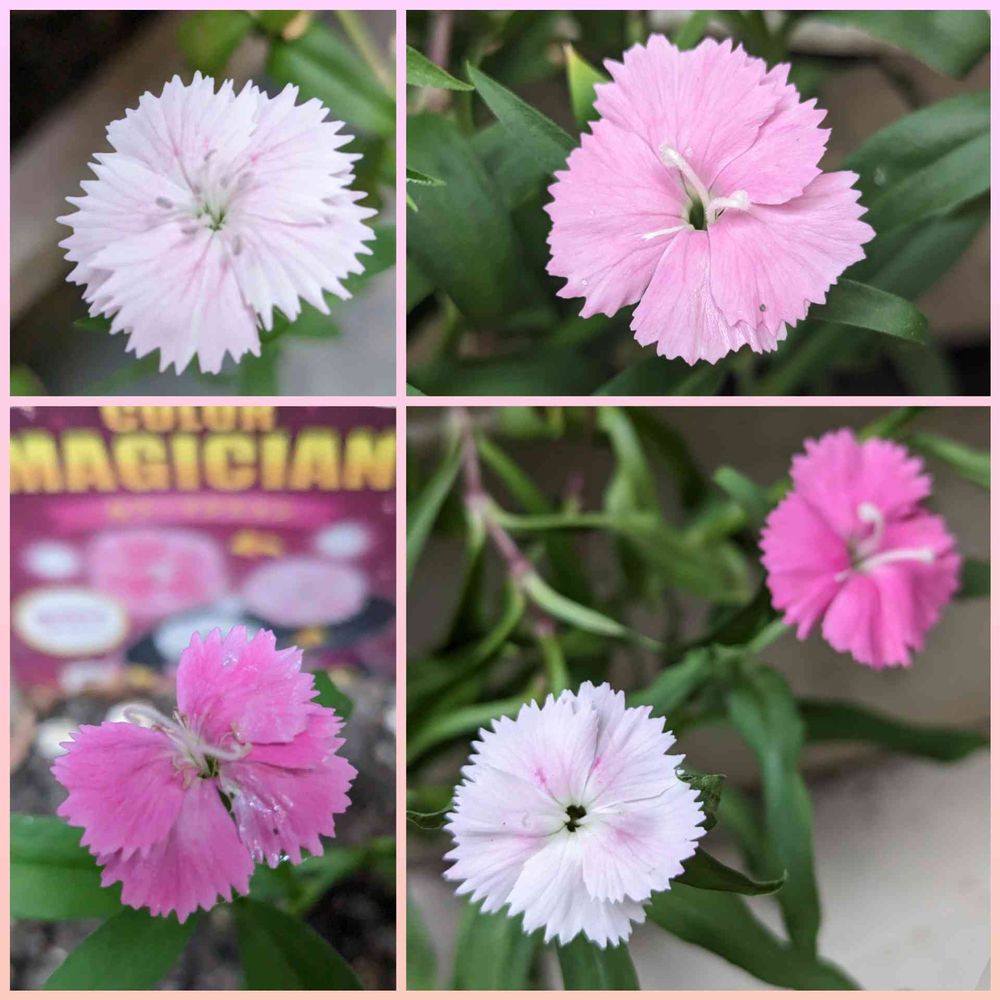 これは「カラーマジシャン」と言う品種で、白から淡いピンク色、濃いピンク色へと花の色の変化が楽しめる四季咲きのナデシコです🤗💕