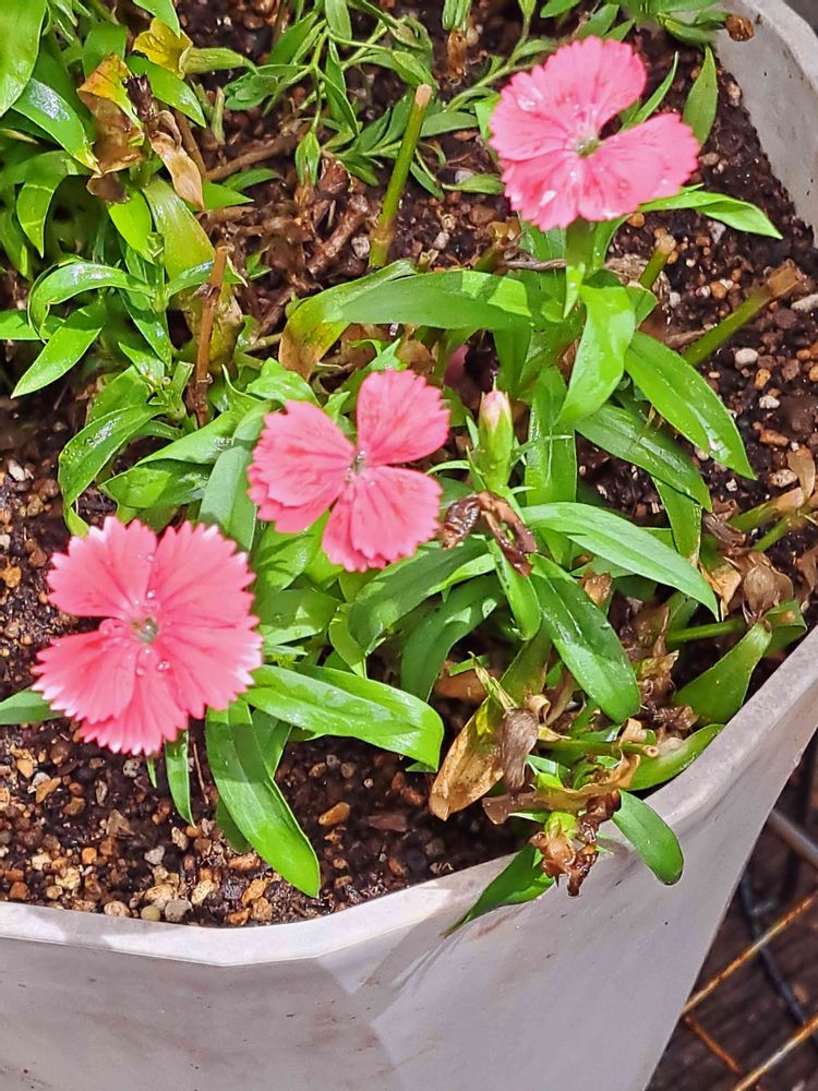 猛暑と台風🌀の雨が重なり、鉢植えのなでしこは疲れ気味のはず🤔