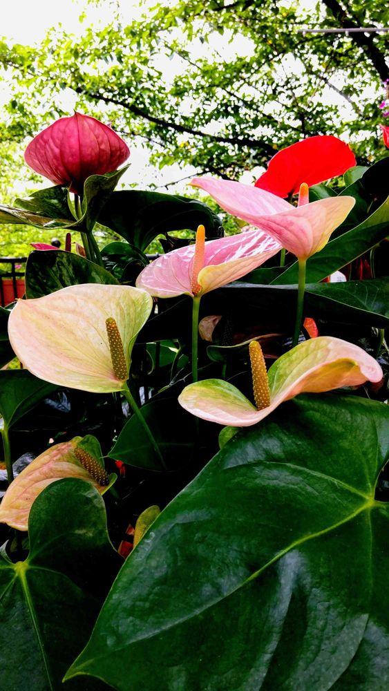 アンスリウムは屋根のある通路にポッドが置かれてますが風は吹きざらしです。