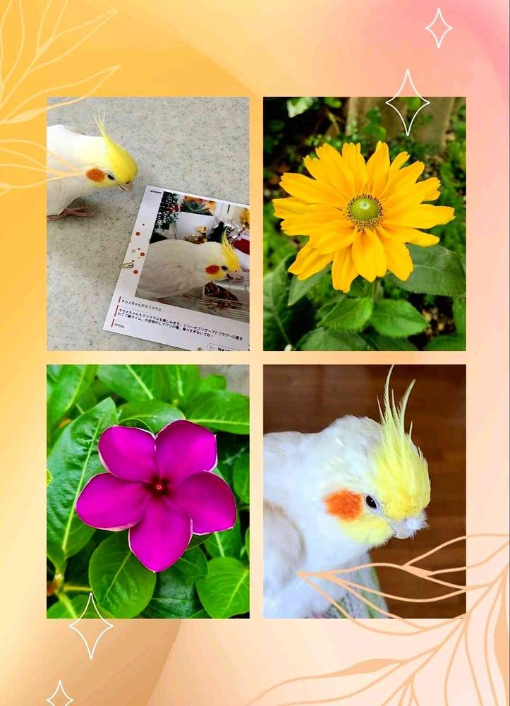 今月はオカメちゃんと夏の花(日々草とルドベキア)のコラボです。