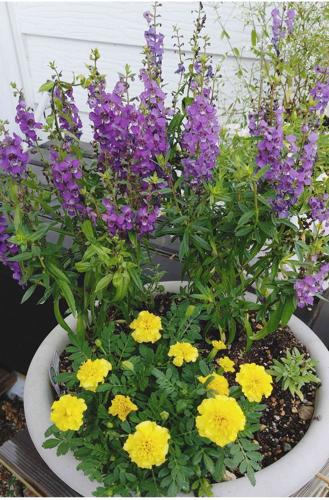 アンゲロニアサンと零れ種のマリーゴールドサンの寄せ植えが、良い感じになって来ました🤗💓