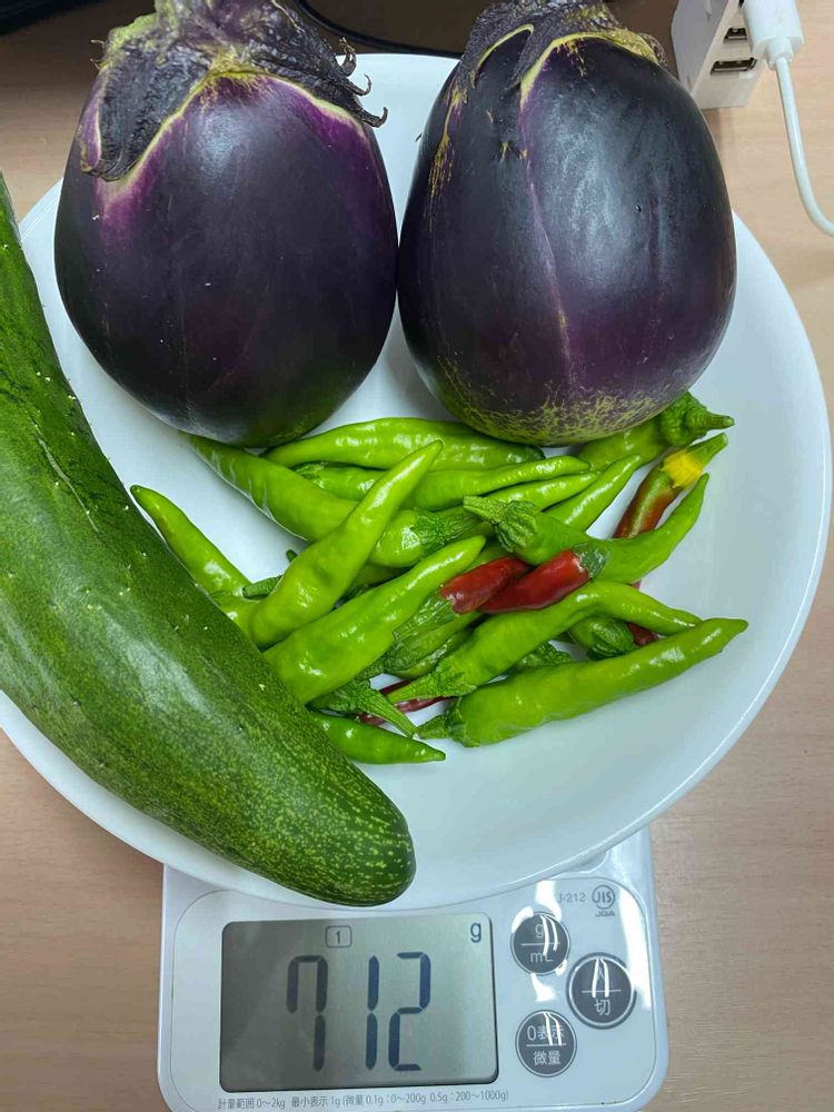 今朝の収穫😍ここ数日の雨のおかげで一気に大きくなりました✨茄子、伏見甘長、チリ。炒め物にします😋