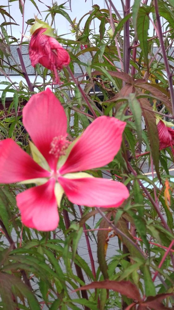小田原駅前にて💗 モミジアオイ、大きな鉢に、はいって、風に、揺れて居ます❤️