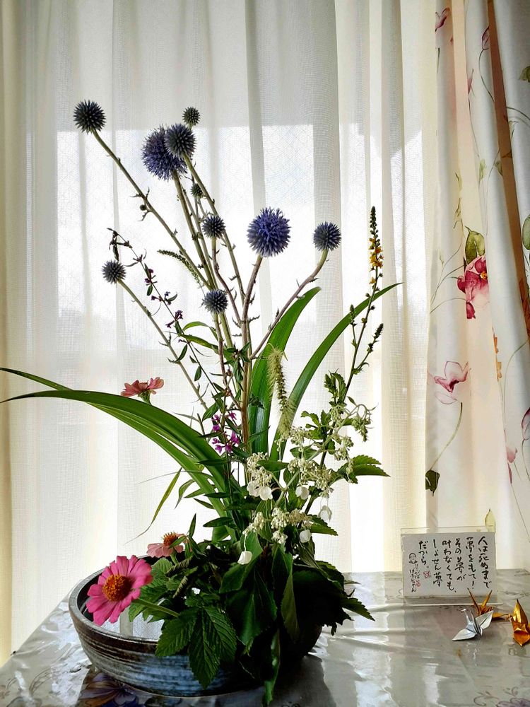 これは、「野の花を活ける」というテーマの展示講習会に行ってこられた入居者さんの作品です🎵
