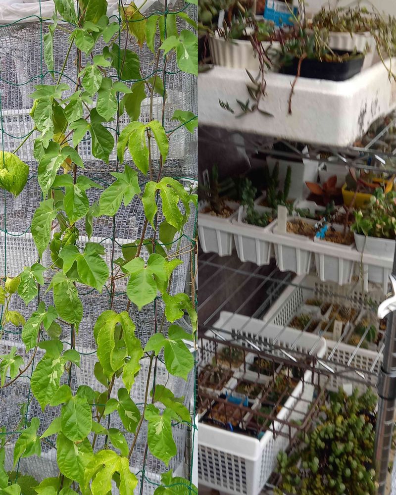 昨夜から雨はしっかり降っているけど、風はそれほど強くなく、外の🌵棚も多肉棚も倒れる事もなく、日よけ朝顔、スズメウリ、パッションフルーツも無事🌿