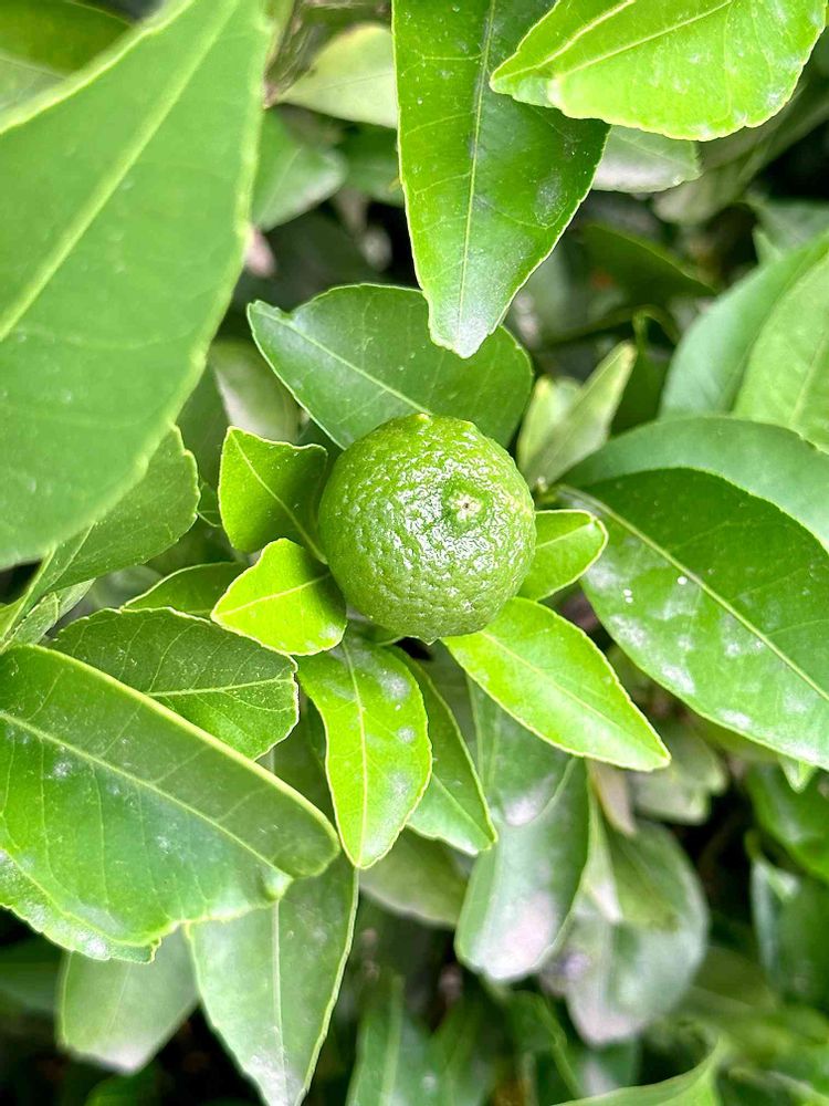 【紀州みかん】の果実。直径2.5センチくらいかな。成長し成る木になったらしく、昨年に引き続き今年も数個実を付けました。寒さに強いので唯一の地植え。