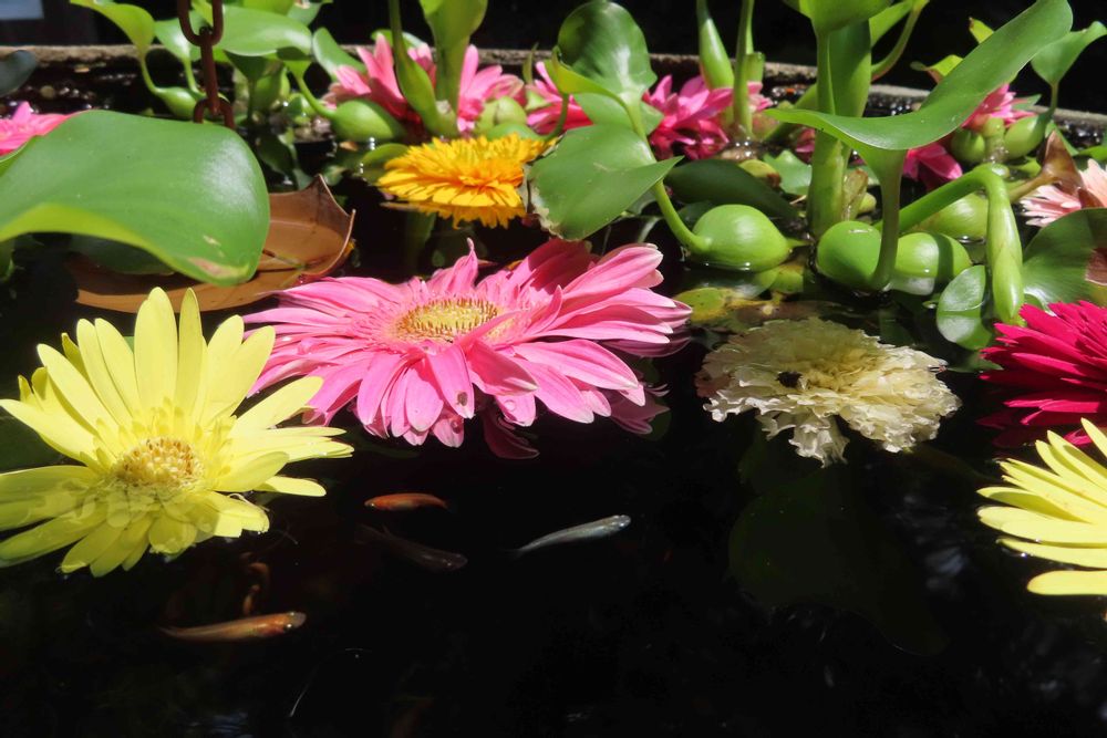 花手水に浮かぶガーベラと泳ぐメダカです。