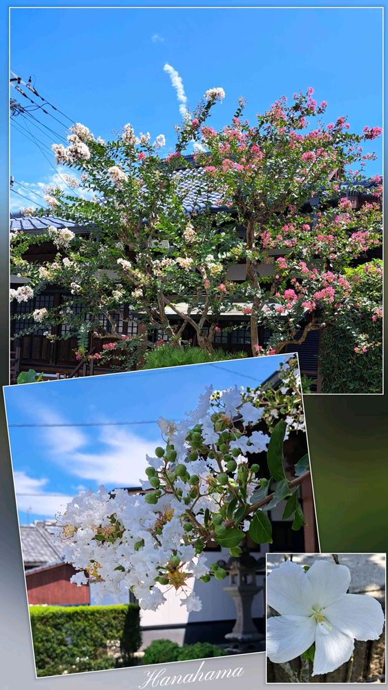 お寺さんに白花とピンクのサルスベリ