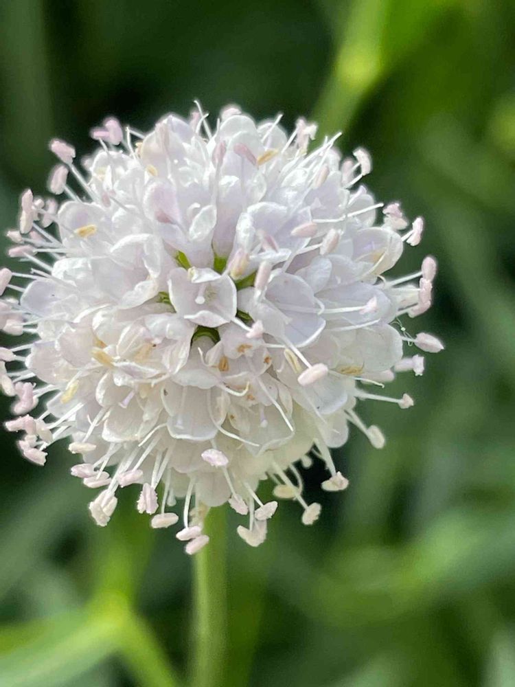 法事で久々の帰省。庭先の丸い純白の花が風に揺れてました。サクシセラと教えて頂きました。