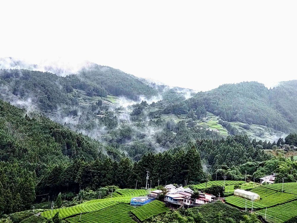 山奥自宅集落もこの画の集落も、自分の家で飲むお茶は自分の家の茶畑の茶です。新茶の時期の茶畑一面は眩しいくらいの色になります。