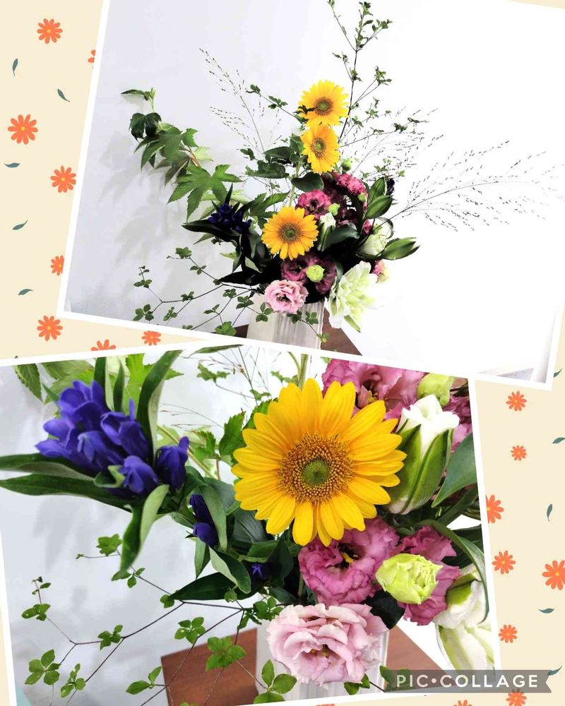 元気カラーのヒマワリに夏らしさを感じながらもリンドウや柔らかな枝物の木いちご・ドウダンツツジ、線の細いパニカムが涼し気な秋の訪れを予感させてくれます🎶