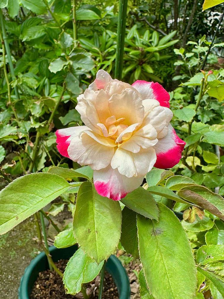 【ダブルディライト】花弁の縁のピンクが綺麗ですね。このバラも夏バテ気味ですがなんとか2番花を咲かせています。