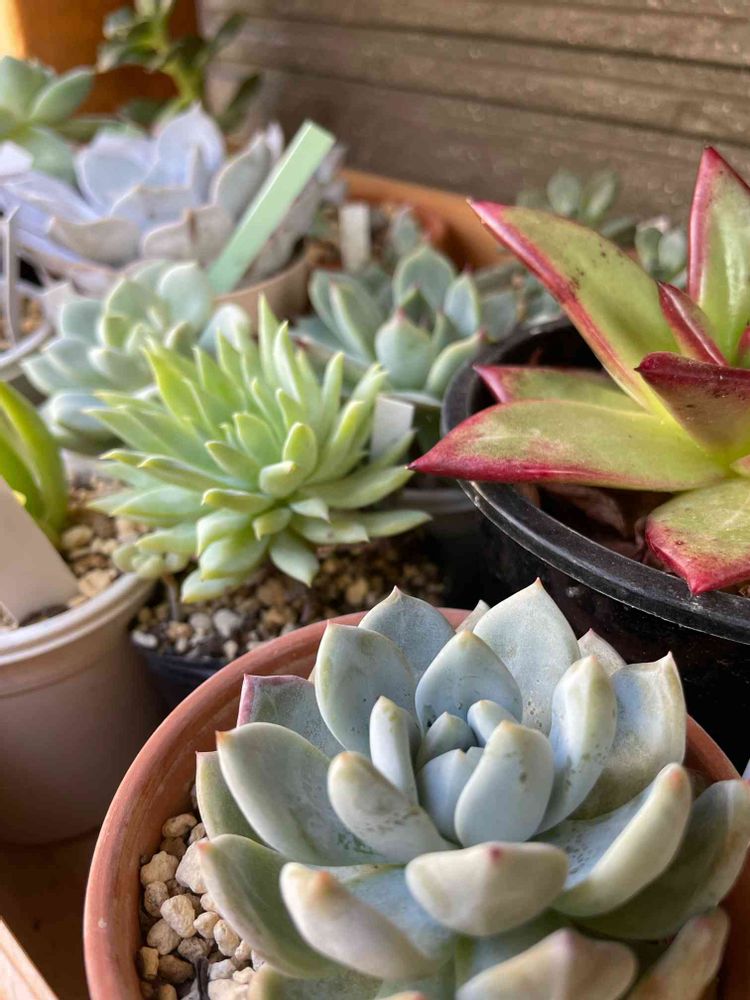 我が家の多肉棚。なんとか元気な子もいるけど焦げ焦げ、ボロボロの子も出てきて泣く😢早く涼しくなってほしいよ( -᷄ω-᷅ )