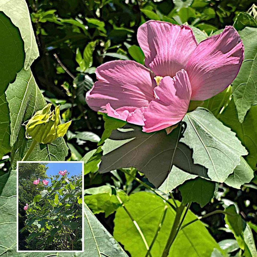 そこに出逢い見たのは、その真っ青な空を仰ぎ見るようにして、2mいや3mもあろうかの低木の先ほどに、花径15cm以上はありろうかの綺麗なピンクの5弁の花が幾つか。