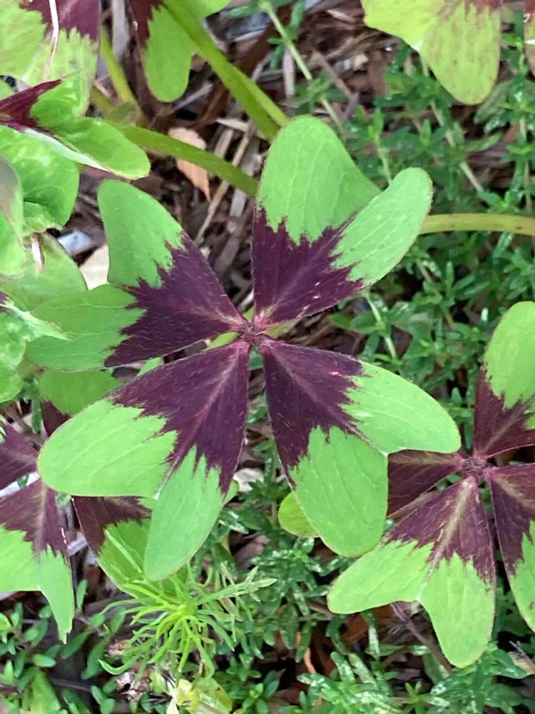 4つ葉のクローバーと見間違うような形です。クローバーとの見分け方はクローバーは葉に白い模様が入ること。モンカタバミの花は赤いです。