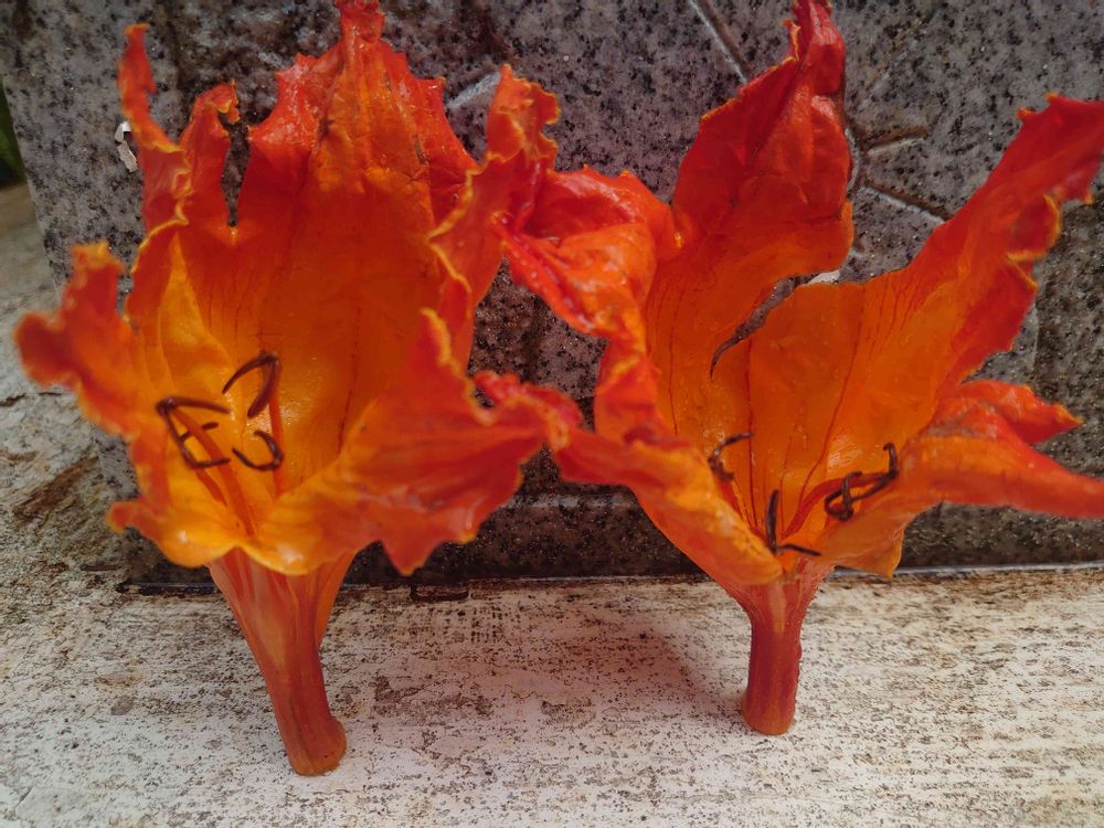 慰霊碑の建つ丘に、大きなカエンボクがあったことに今更気づきました。手のひらほどもある大きなオレンジ色の花は本当に炎のようです。