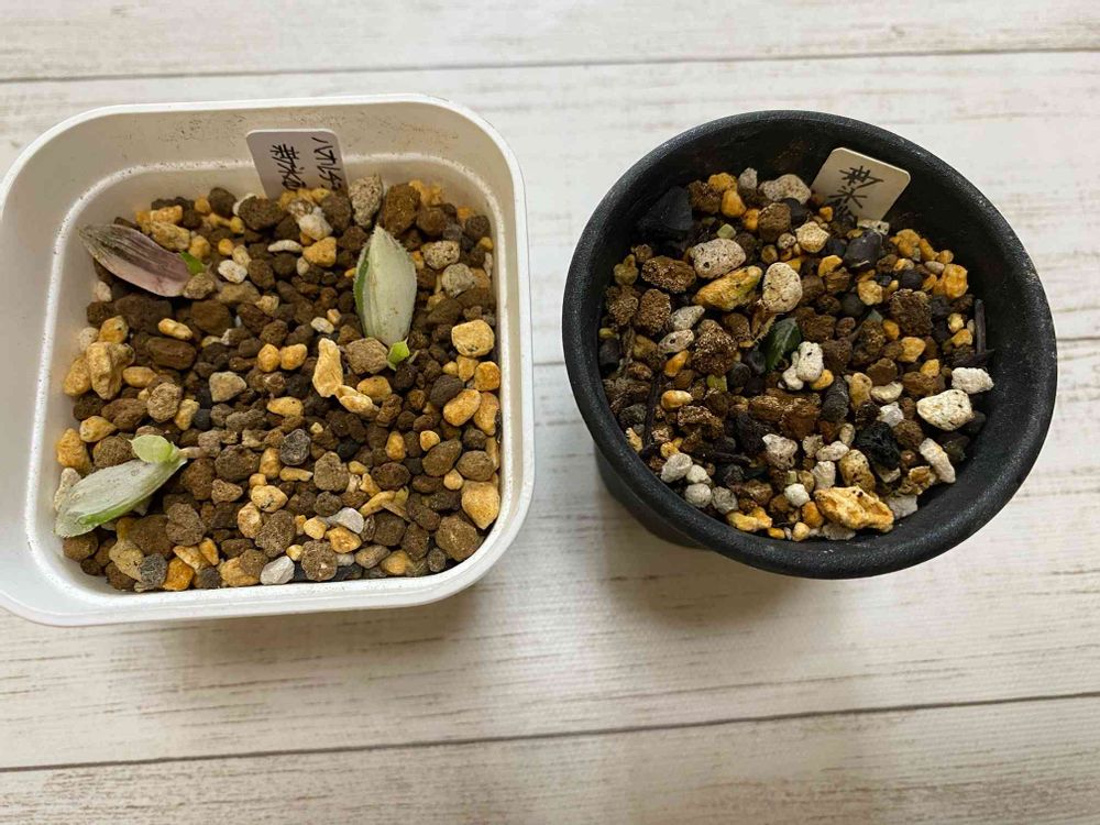 右の親は外で瀕死ですが、葉挿しが元気だから良し👌