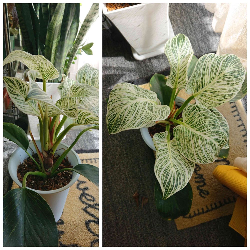 これって!思い描いてたバーキンさんです。家のと全然違う…個体差あり過ぎなんでしょうか?家のは3株植わっててボリュームありますが緑多めのシマシマです。こちらは今日買って来たのですが1本で太いです直径4cm位で、葉っぱも15×10cm大きいですよね?高さは鉢入れて55cmです。眩しいくらいに白い多めです。家のも大株になるとこうなるのか…個体差なのか…育て方なのか…