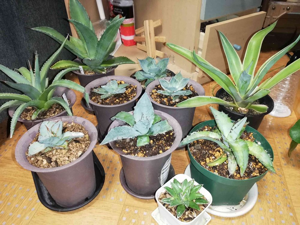 はじめて投稿します。ベランダで育ててるアガベ達。今日は風が酷く強くてお家に避難してます。