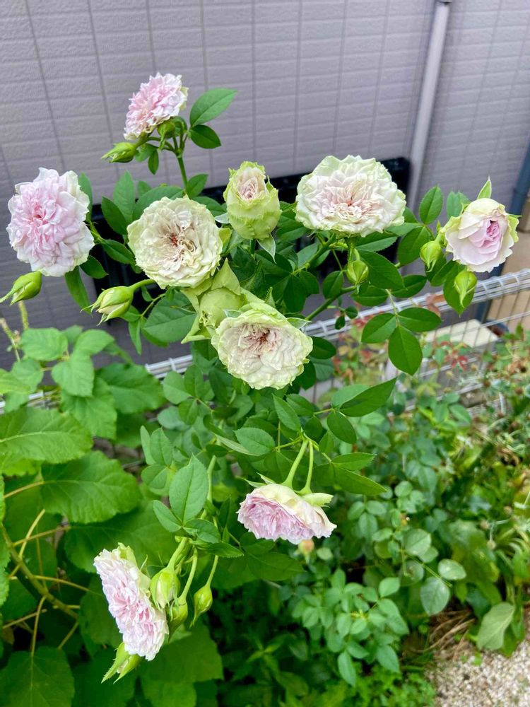 🌹今年1月に植えたコフレさん😆春から7月までは殆ど蕾のままボーリング🟢💦放置のシュート1本にこれだけ咲きました🥰💕株が弱るのでこの後✂️✨グリーンが綺麗な子です❣️