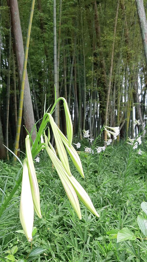 見事なまでの竹林の前にあちこちに咲いているタカサゴユリさん