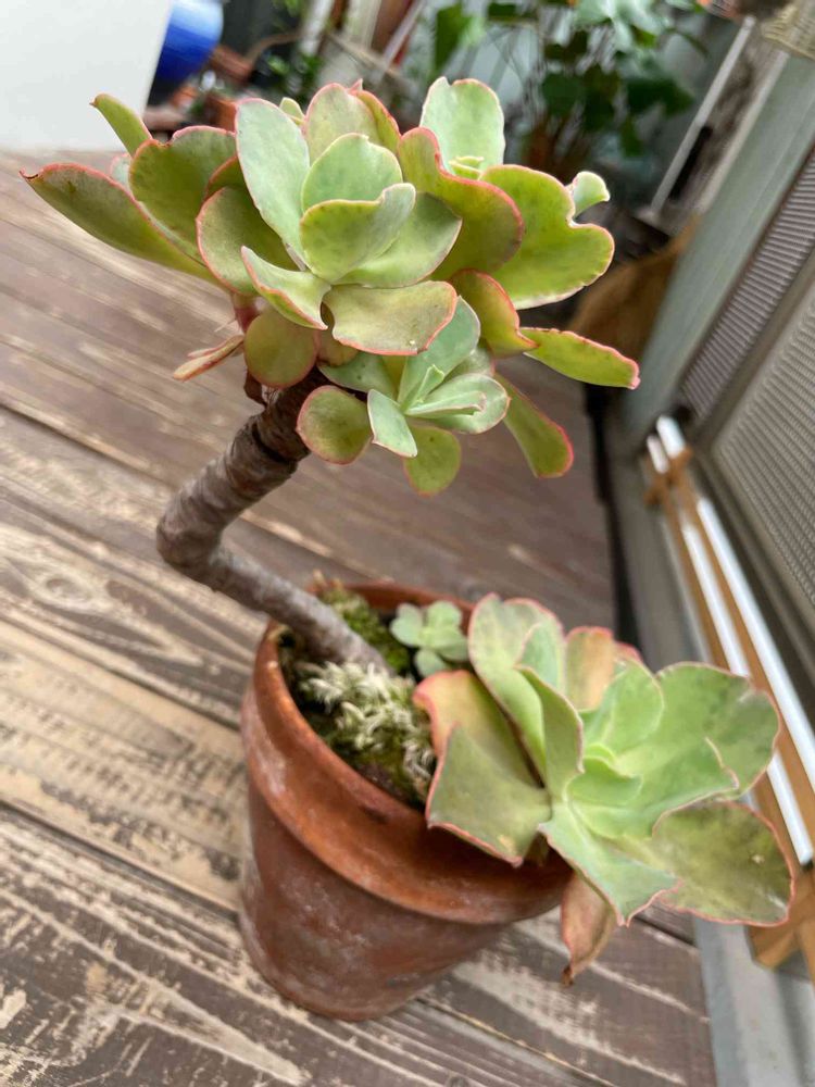 多肉を始めた頃からいるので結構長い付き合いの翁さんです。ピンクから淡いグリーンへのグラデーションが美しい。水が好きなようで切らすとイジけるので、真夏でも乾いたらたっぷり水をあげています。