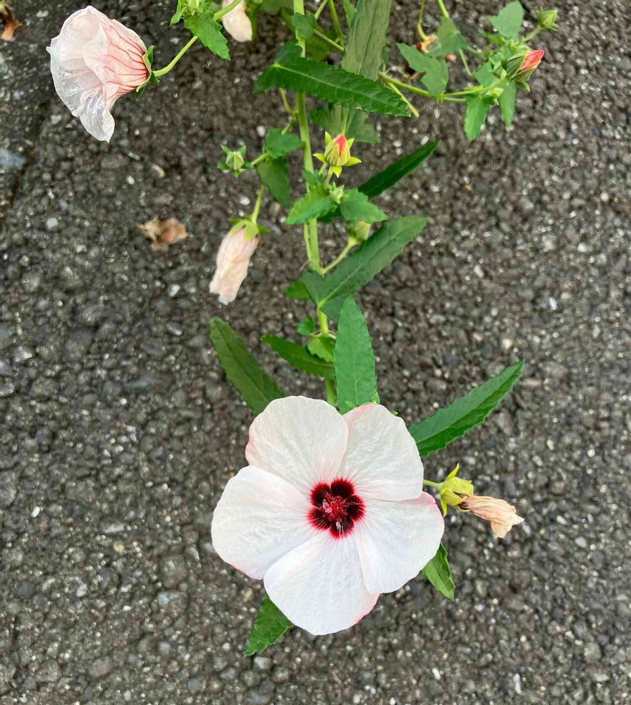 あらま🙀芙蓉なのに 寝ながら咲いてる🩷❤️それもアスファルトの上にお花が咲いて。暑い🥵😵だろうに。頑張り屋さんね😆😆😆😄😄🙀😺😺😍