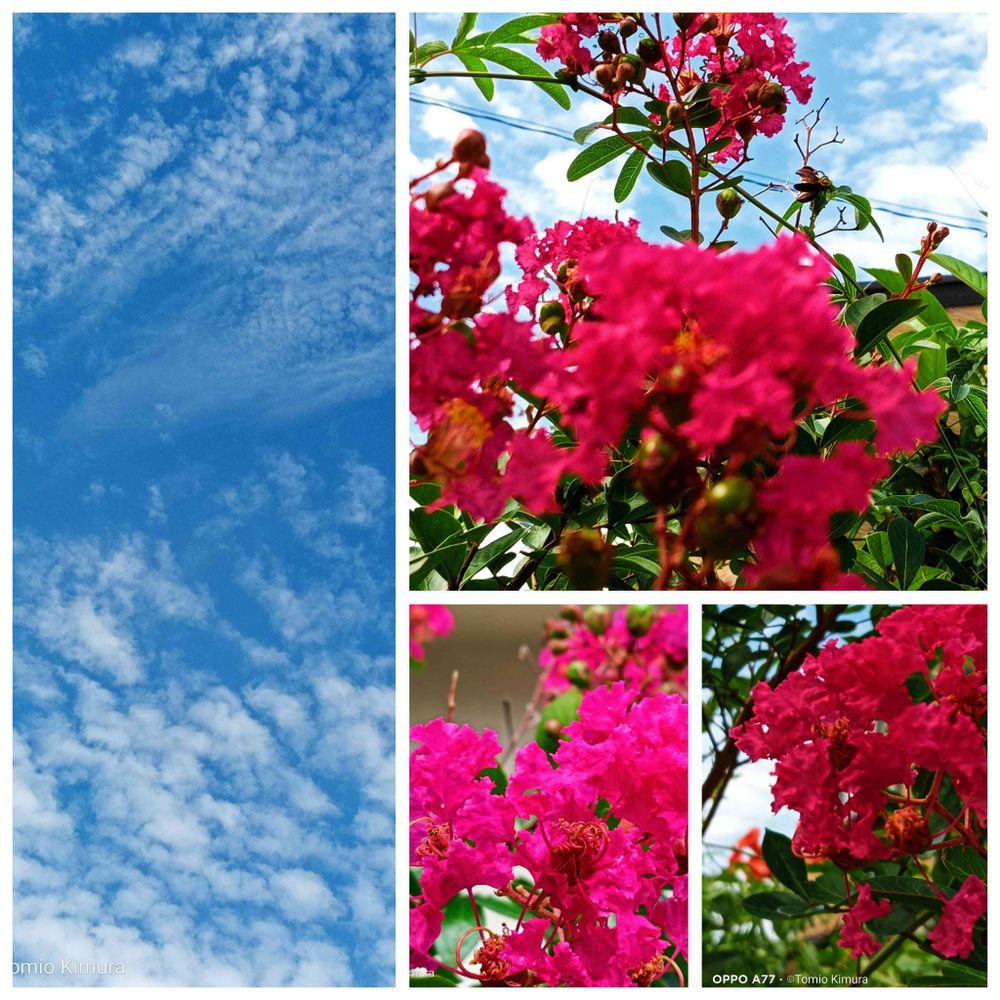 見上げると、秋を彷彿とさせる雲と真赤な百日紅の競演が、、、