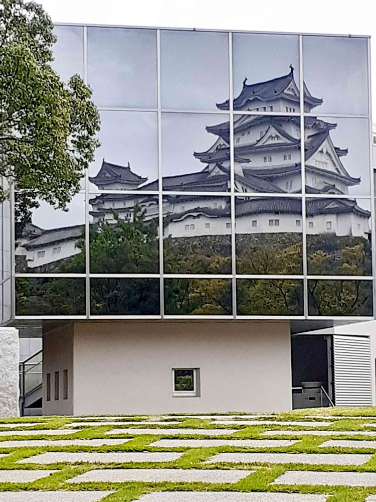 県立歴史博物館の鏡窓に映る姫路城(シロトピア記念公園)