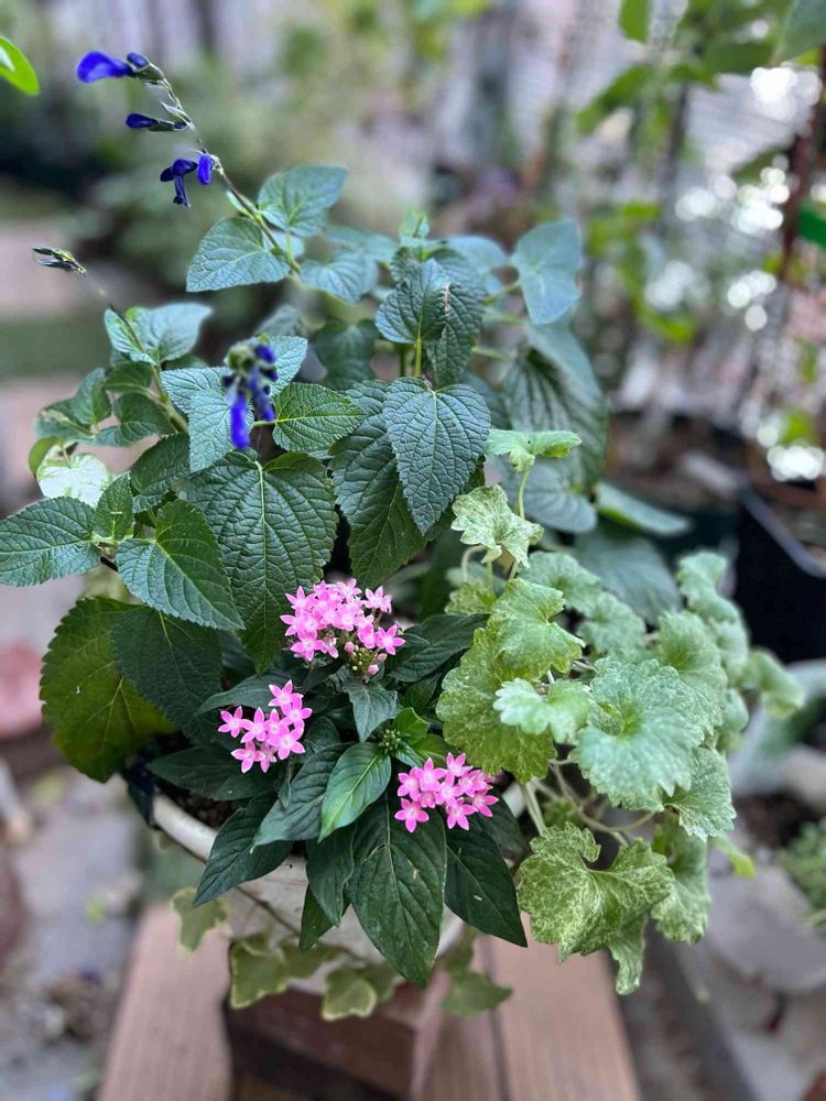 ピンク🩷のペンタス、ブルーサルビア🟦、明るい緑色🟢のラミウム、アイビーがちょっと。