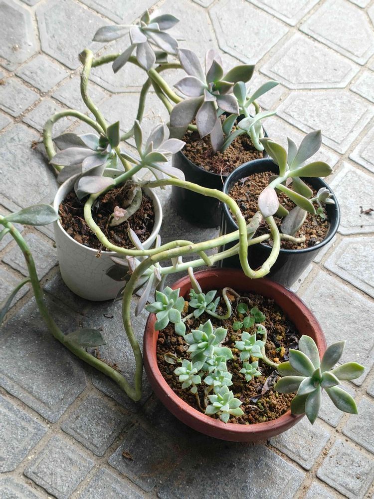 手前の茶色の鉢は葉挿しで少し大きくなっていますが後の3鉢はへびの様に暴れています😅‼️