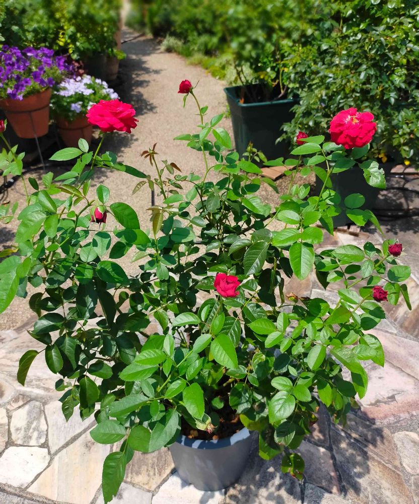 すると、みるみる成長し、シュートも出し始め、こんな暑い中お花もたくさん咲かせています🤗💖ハダニにやられている鉢薔薇が多い中、葉っぱもツヤツヤです✨お部屋が狭かったんだね〜😅
