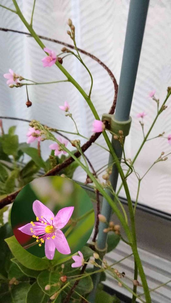 葉からニョキッと茎が伸びて小さな小さなピンクの花が咲きます