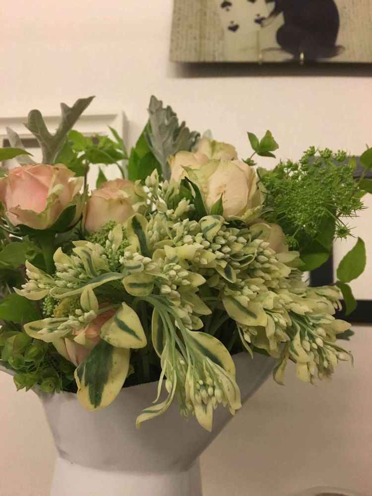 真ん中の蕾のたくさんついた花の名前を教えてください。斑入りの葉の白っぽいものです。