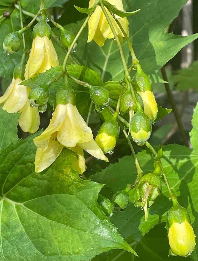 ところが、八ヶ岳南麓のカフェのお店の庭にキレンゲショウマとレンゲショウマが咲いていた。蕾は球形で豆電球のように見える。森林の奥深い薄暗いところで生息しているので、確かに灯りが点ったように感じる。黄色い花は肉厚で、平開せず、下向きに咲くところが奥ゆかしい。まばらな円錐花序となっている。