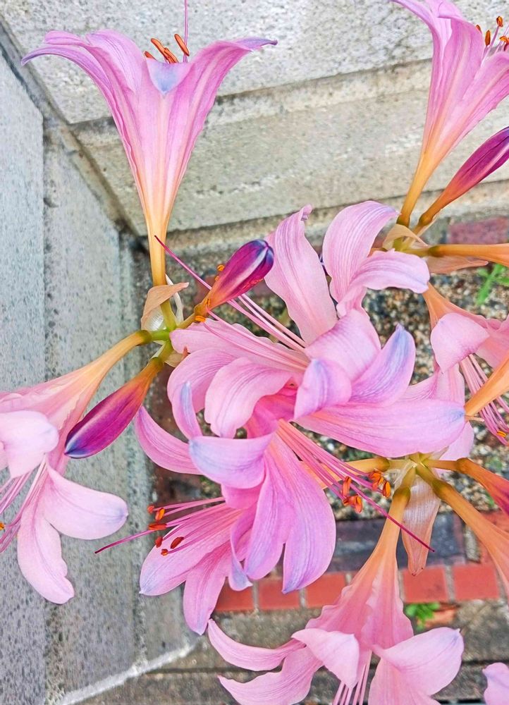 散歩道のブロック塀に囲まれた所に、リコリスの花が咲いていました。